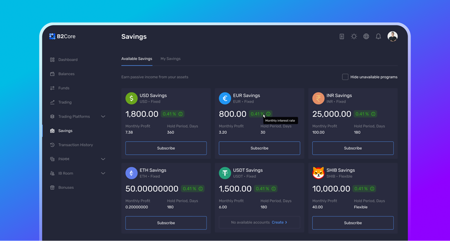 The savings feature is highly customisable and configurable. The annual interest earnings option will motivate the clients to retain their funds within the broker’s ecosystem. Moreover, it allows brokers to boost fund retention and liquidity within B2Core, creating a mutually beneficial scenario for all parties.